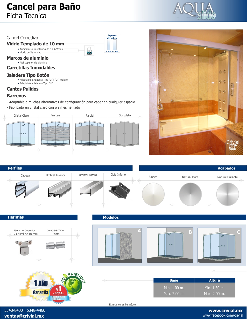 Fabricamos en vidrio templado de 10mm y adaptable a una enoarme variedad de baños y regaderas. Un cancel que brindará elegancia a su baño y alta eficiencia para el contro del agua.