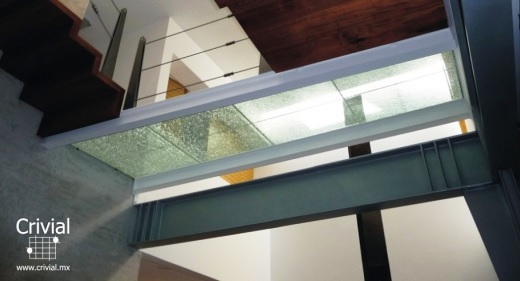 El vidrio craquelado, a su vez, es un vidrio laminado formado por tres láminas de vidrio templadas, en el que se fractura con un punzón la pieza central, misma que se fragmenta en miles de partículas, que quedan a trapadas entre las dos láminas de vidrio exteriores, brindando una belleza poco común, con un alto grado de seguridad.
